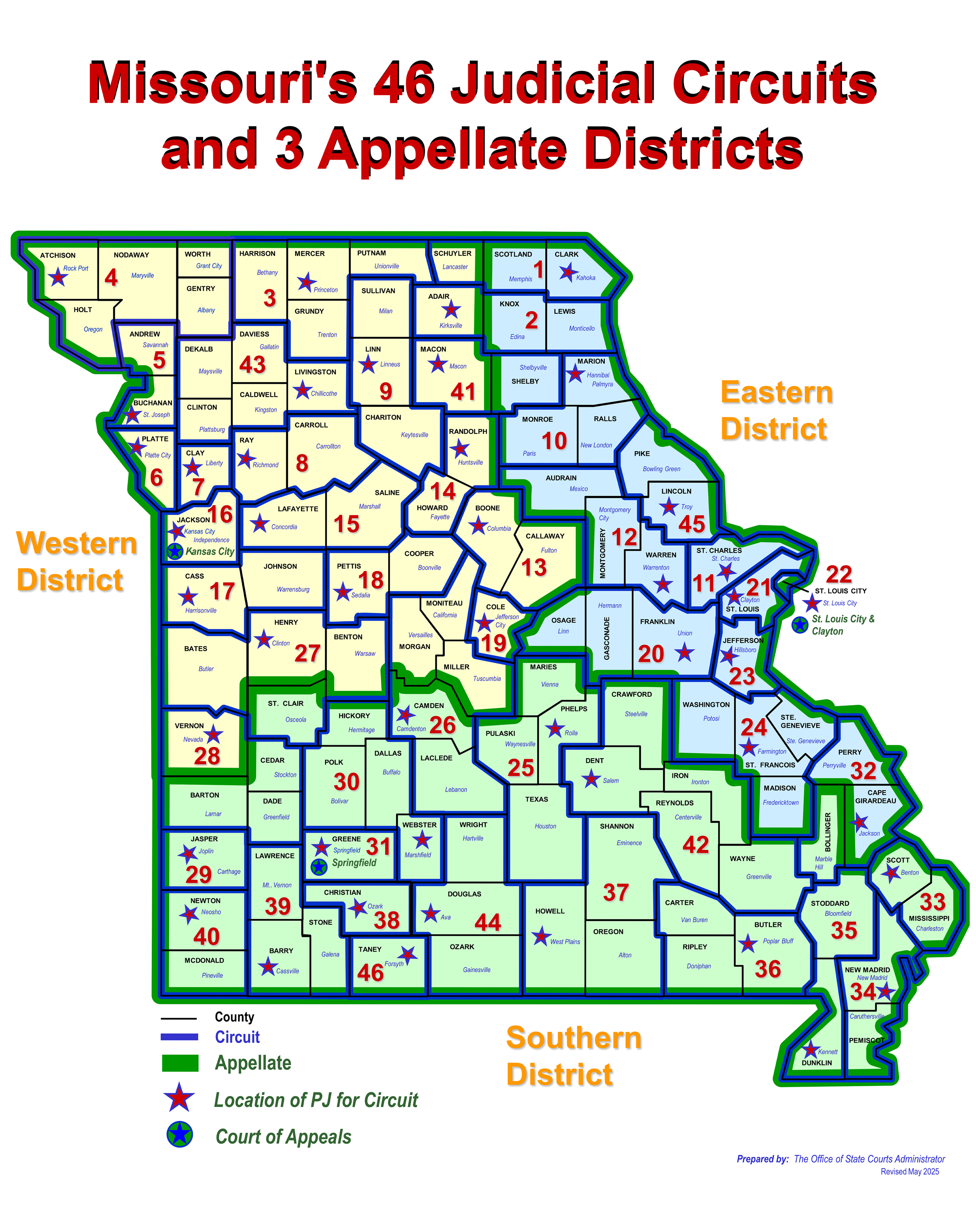 Missouri's counties and the city of St. Louis are organized into 46 judicial circuits. There is a court in every county. The circuit court is typically in the county seat (or the city of St. Louis) and may be in additional locations in the county. See this list of courthouse addresses.