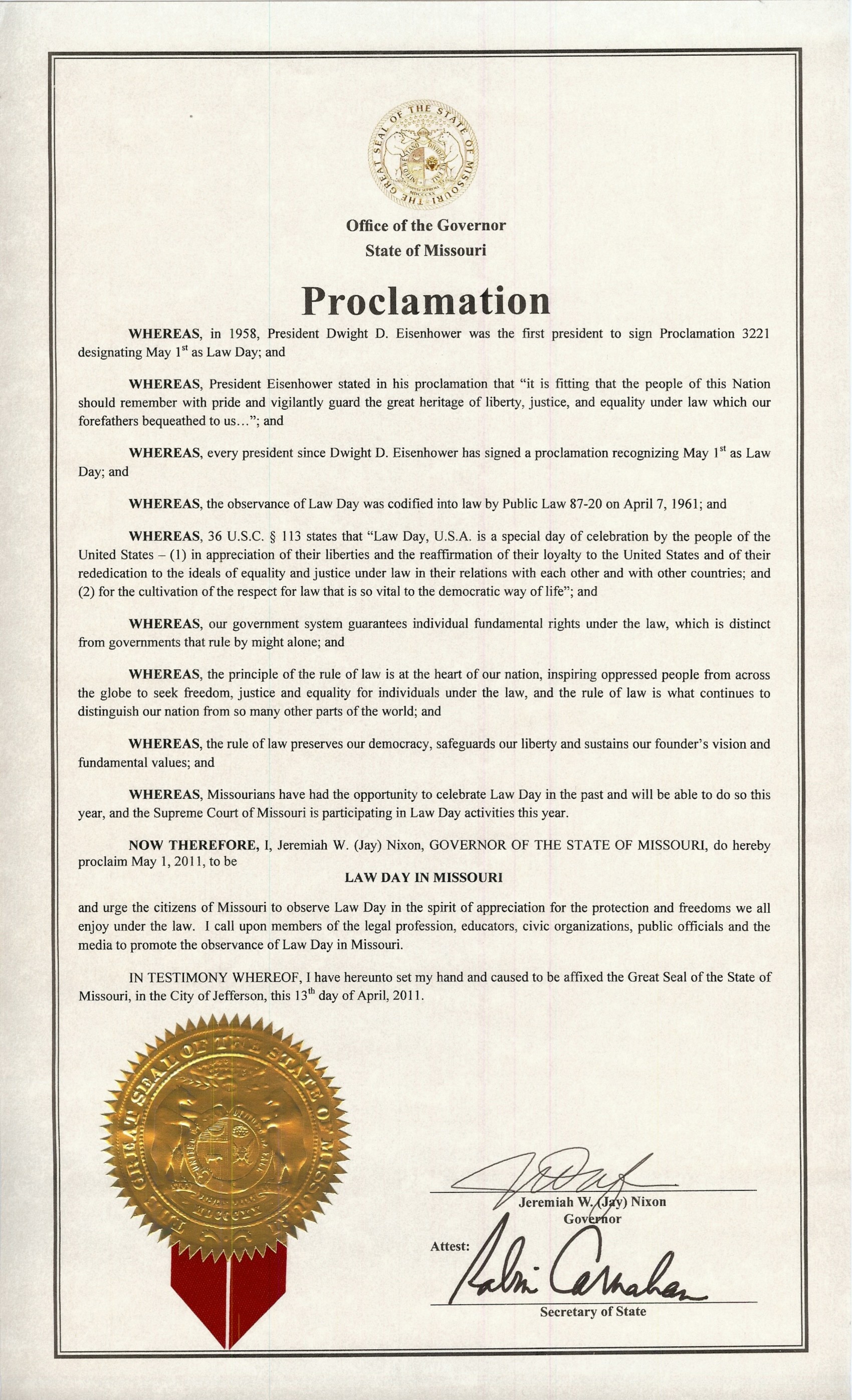 In his proclamation, Nixon “urge[s] the citizens of Missouri to observe Law Day in the spirit of appreciation for the protection and freedoms we all enjoy under the law” and “call[s] upon members of the legal profession, educators, civic organizations, public officials and the media to promote the observance of Law Day in Missouri.”
