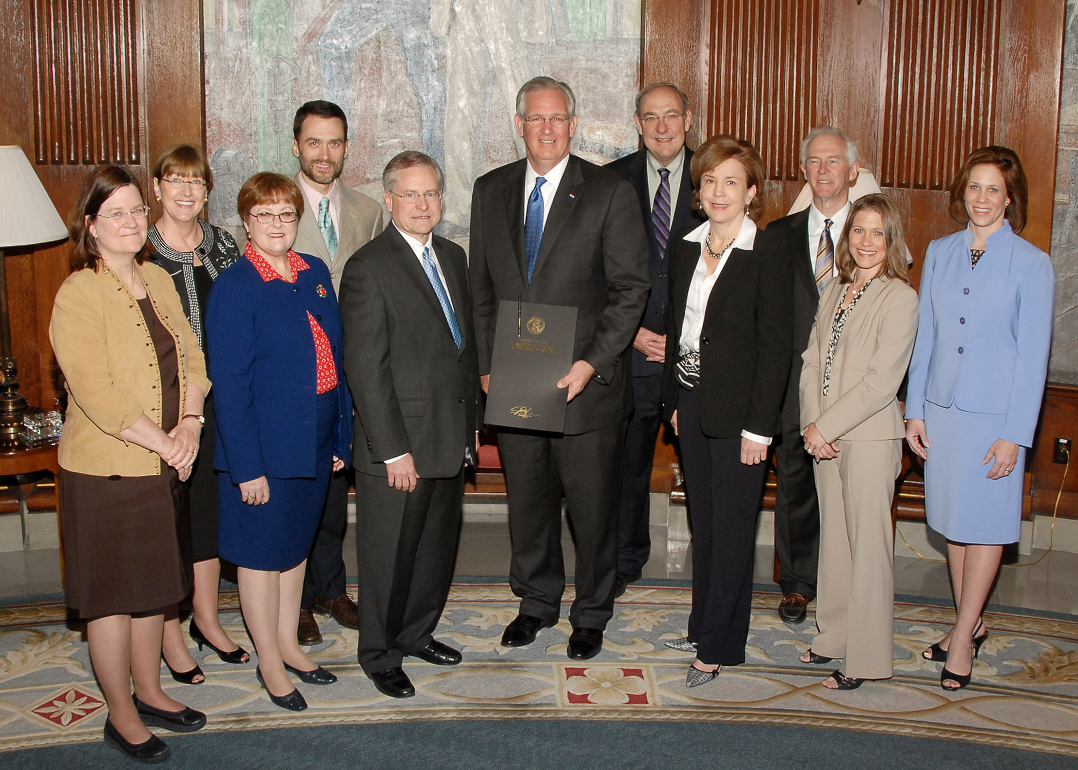 (Photo courtesy of the Office of Missouri Gov. Jay Nixon. From left: Supreme Court Judge Laura Denvir Stith; Supreme Court Judge Patricia Breckenridge; Supreme Court Fellow Mary V. Moore Johnson, a professor from Southeast Missouri State University; State Courts Administrator Greg Linhares; Chief Justice William Ray Price Jr.; Governor Jay Nixon; Supreme Court Judge Michael A. Wolff; Supreme Court Judge Mary R. Russell; Keith A. Birkes, executive director of The Missouri Bar; Sebrina A. Barrett, deputy executive director of The Missouri Bar; and Beth S. Riggert, communications counsel for the Supreme Court of Missouri.)
